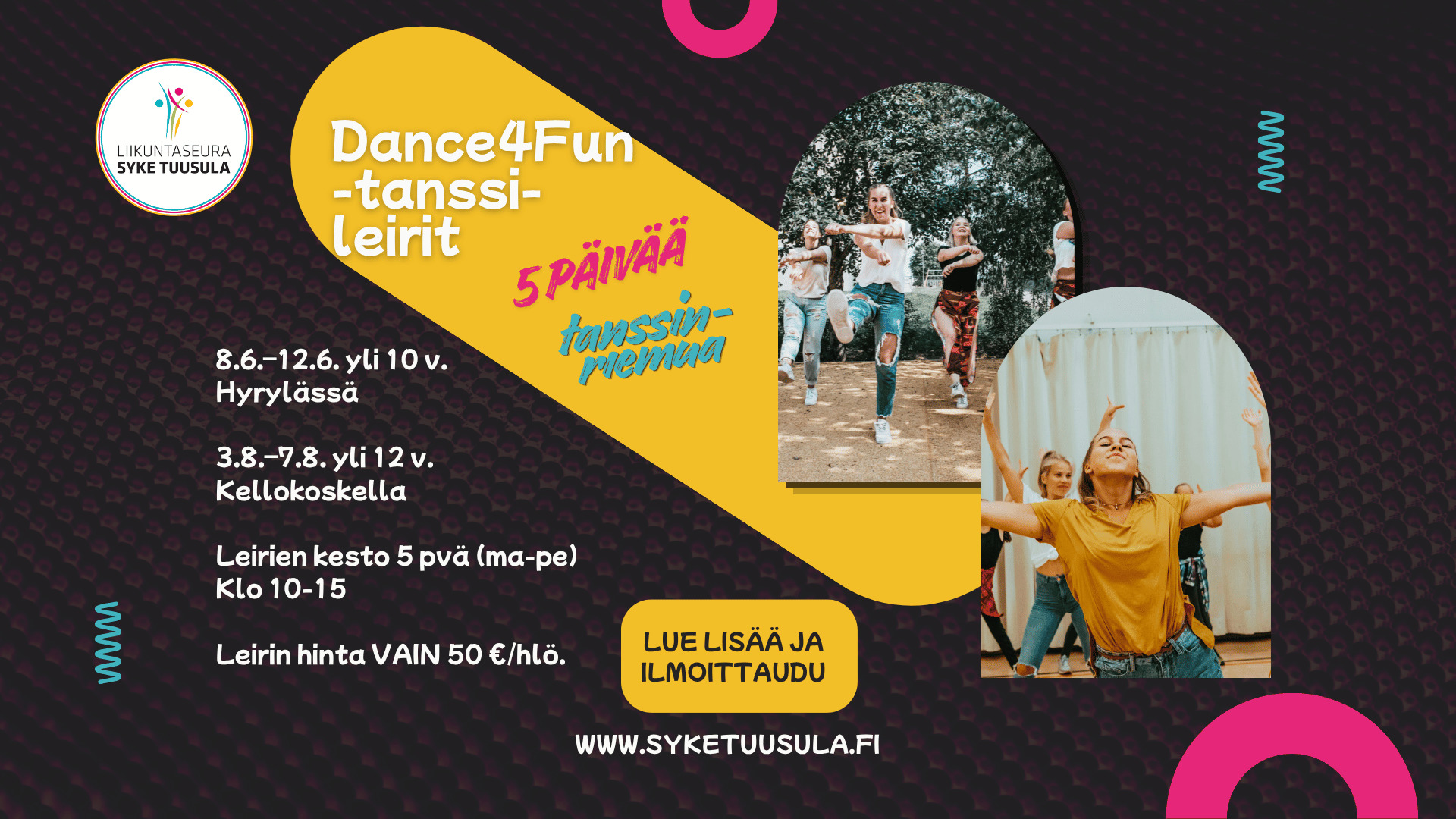 Enna Raijas2026-04-09T10:55:04+03:00Energisin/mieleenpainuvin/ihanin tanssikokemus odottaa! Dance4Fun –tanssileirit ovat täynnä iloa, hyvää musiikkia ja tanssinriemua. Leirejä järjestetään kaksi, Hyrylässä ja Kellokoskella. Aiempaa tanssikokemusta ei tarvita. Kesäkuussa (8.6.–12.6.) yli 10 v. Hyrylässä (Tuusulan Uimahallin liikuntatilat) Elokuussa (3.8.–7.8.) yli [...]